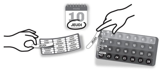 Le 1er jour d’utilisation de votre plaquette, collez l’étiquette*, du jour de la semaine correspondant et prenez le comprimé numéro 1. Les jours suivants prenez les comprimés environ à la même heure de la journée, dans l’ordre chronologique jusqu’au 28ème jour. Les numéros vous indiquent l'ordre dans lequel vous devez prendre les comprimés.