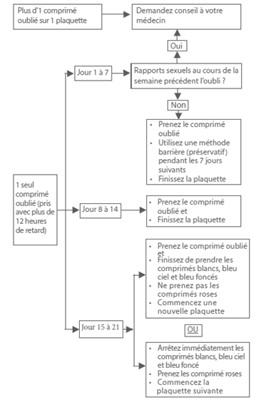 La conduite à tenir pour les comprimés oubliés peut être guidée par les deux règles de base suivantes :