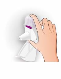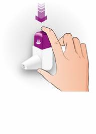 · Continuez à tenir l’inhalateur en position verticale entre votre pouce et votre index. · Appuyez jusqu’à ce que vous entendiez un clic, puis laissez le déclencheur revenir à sa position initiale en faisant un nouveau clic. Cela libère une dose. · N’appuyez qu’une seule fois.