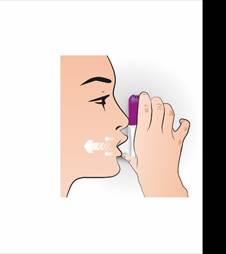 · de ne jamais expirer à travers l’embout buccal, car cela entraînerait une diminution de la dose délivrée. Dans ce cas, le patient doit tapoter l’embout buccal sur un plan de travail ou sur la paume de la main pour vider l’embout buccal, puis répéter la procédure d’administration ;