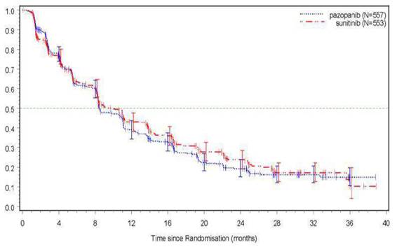 Des cas de dysfonctionnement cardiaque tels qu’une insuffisance cardiaque congestive et une diminution de la FEVG sont survenus dans les études cliniques réalisées avec le pazopanib (voir rubrique 4.8). Dans une étude randomisée comparant le pazopanib et le sunitinib chez des sujets ayant un RCC (VEG108844), la FEVG a été mesurée à l’inclusion et lors du suivi. Des cas de dysfonctionnement myocardique sont survenus chez 13 % (47/362) des sujets du bras pazopanib et chez 11 % (42/369) des sujets du bras sunitinib. Une insuffisance cardiaque congestive a été observée chez 0,5 % des sujets de chaque bras de traitement. Une insuffisance cardiaque congestive a été rapportée chez 3 des 240 sujets (1 %) dans l’étude STS de phase III VEG110727. Des diminutions de la FEVG ont été détectées chez 11 % (15/140) des sujets contrôlés post-inclusion puis au cours du suivi dans le bras pazopanib versus 3 % (1/39) dans le bras placebo.